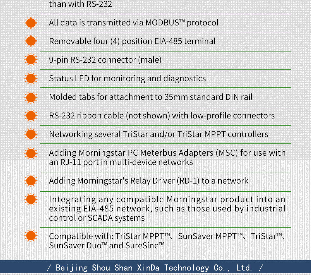 •Integrating any compatible Morningstar product into an existing EIA-485 network, such as those used by industrial control or SCADA systems Compatible with: TriStar MPPT™、SunSaver MPPT™、TriStar™、SunSaver Duo™ and SureSine™.