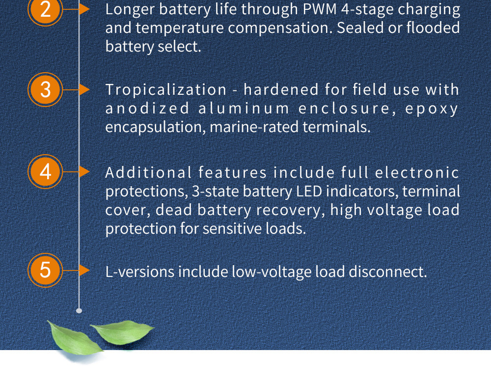 Additional features include full electronic protections, 3-state battery LED indicators, terminal cover, dead battery recovery, high voltage load protection for sensitive loads.